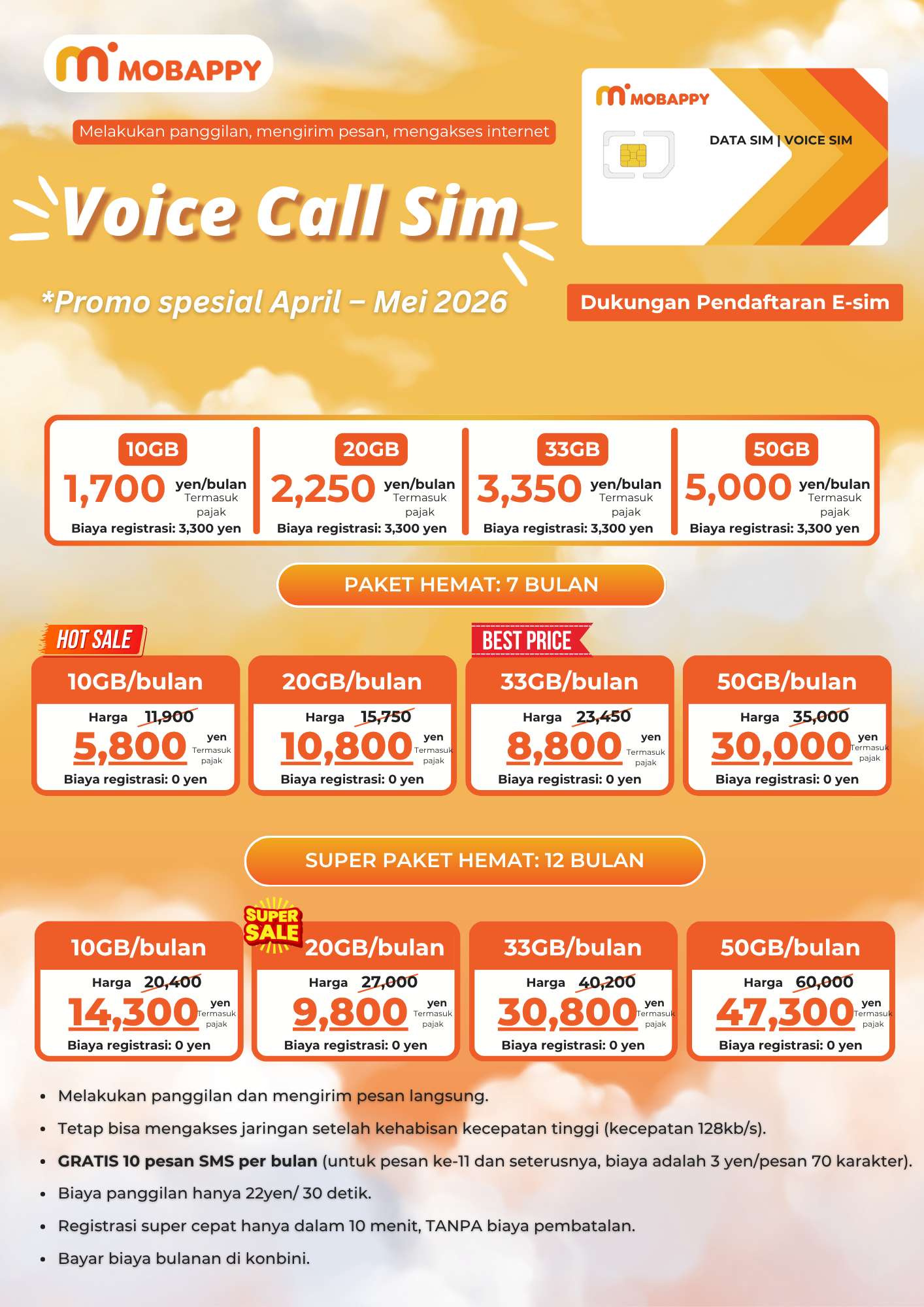 – Paket telepon Hodai (maks. 10 menit): +990¥/bulan. Daftar via WA atau IG.
